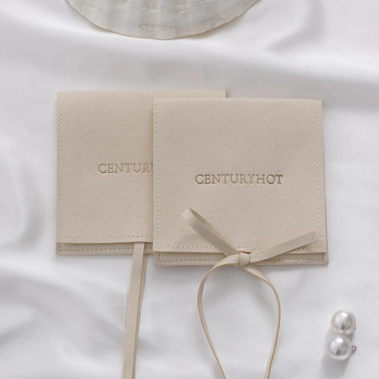 Premium microfiber jewelry envelope pouches with a flap and delicate grosgrain ribbon tie — designed for a refined presentation. Custom debossed logo available, ideal for brands, boutiques, and wholesale.